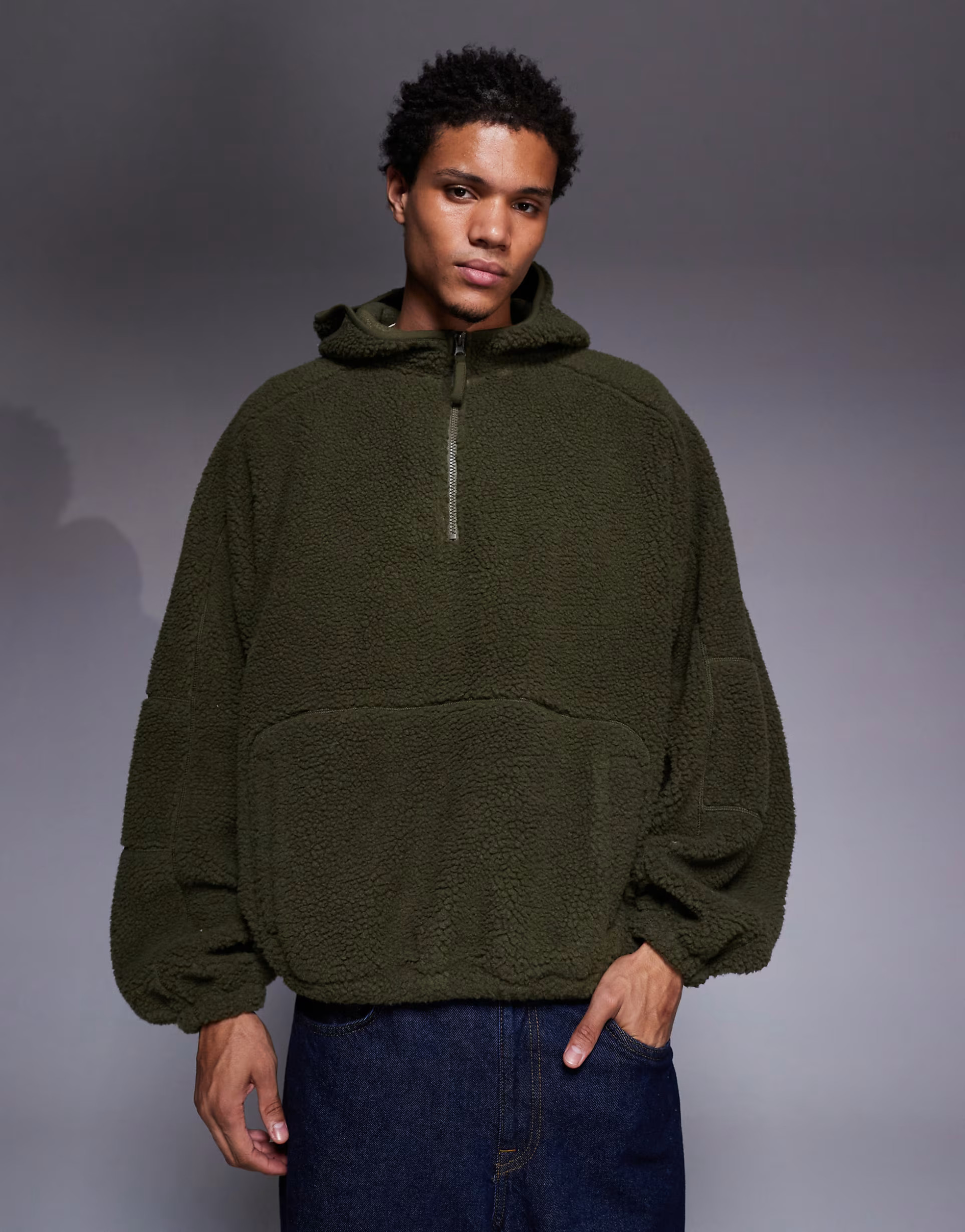 ASOS DESIGN extreme oversized quarter zip funnel neck hoodie in fleece in dark green | ASOS