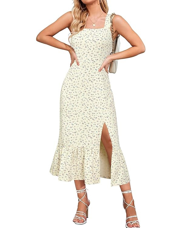 Newshows Womens 2025 Summer Beach Floral Midi Dress Spring Vacation Outfits Square Neck Ruffle Sp...