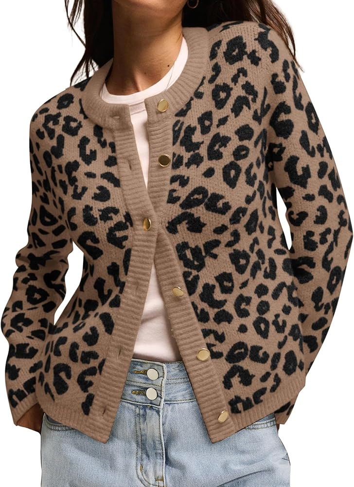 Leopard Cardigan Long Sleeve Open Front Button Up Cheetah Print Top Leopard Sweater Coat Cropped ...