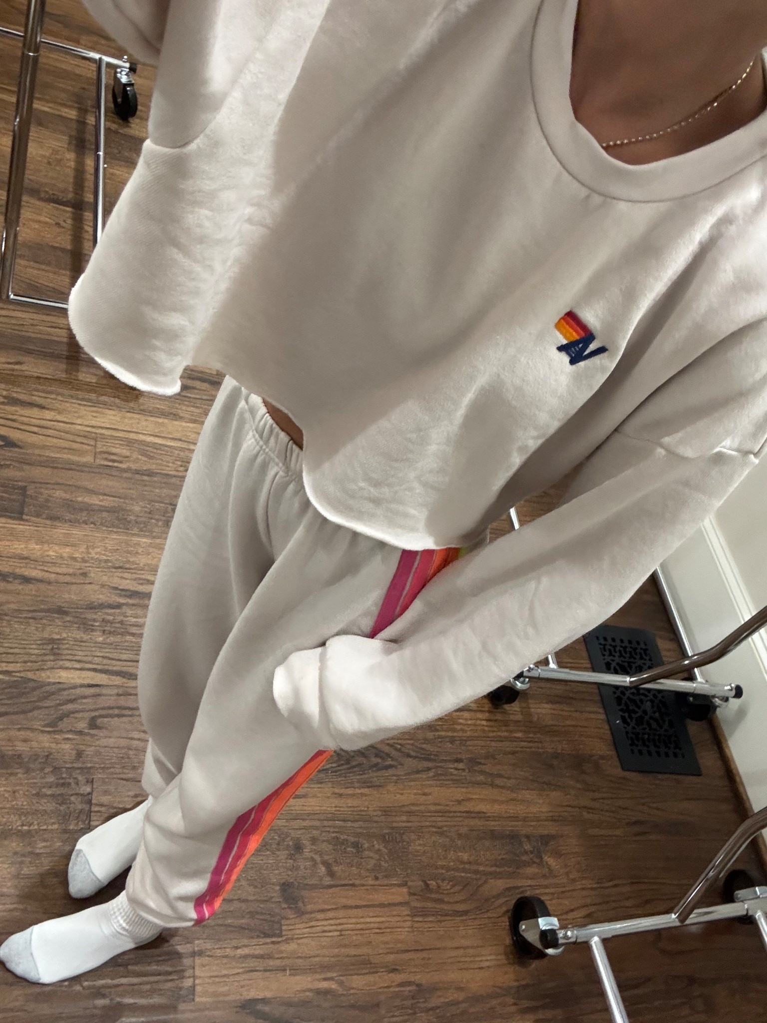Alo black and white set (wearing XS in bra and pullover and XXS in leggings). White puffer is old lulu (linking updated version)