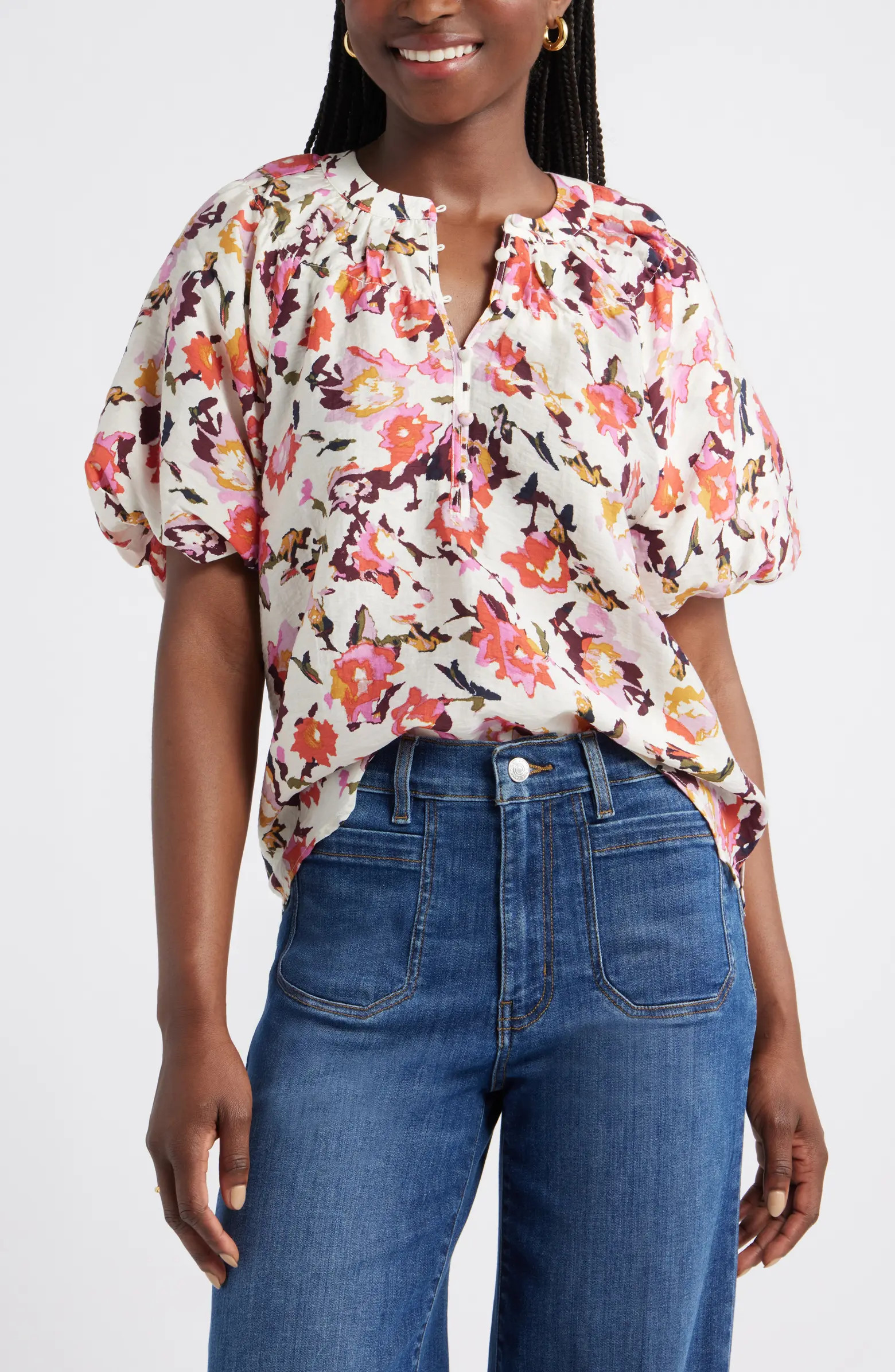 Floral Jacquard Puff Sleeve Top