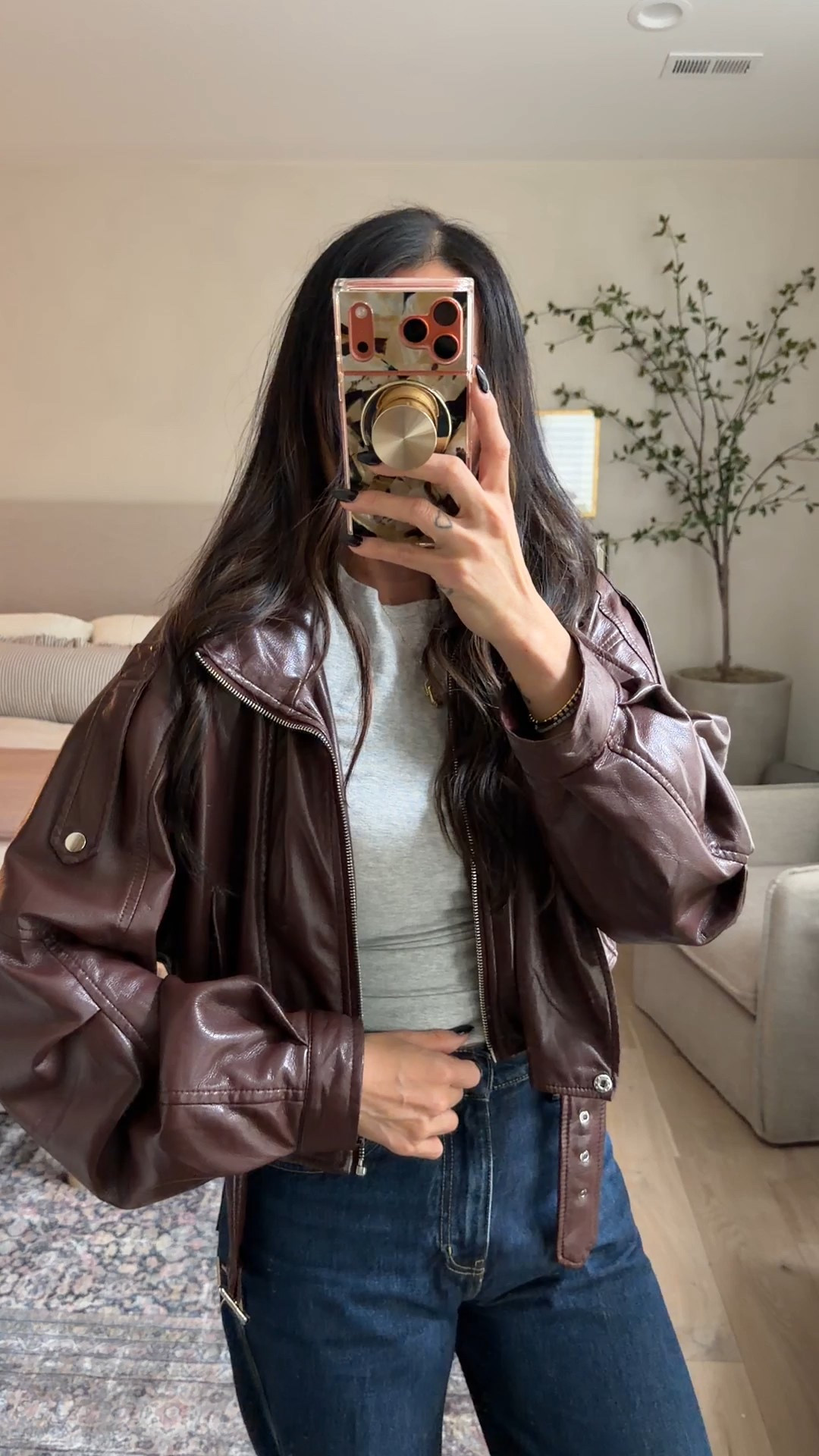 4. Amazon suede jacket styled with wide-leg denim or brown jeans + a black top.
