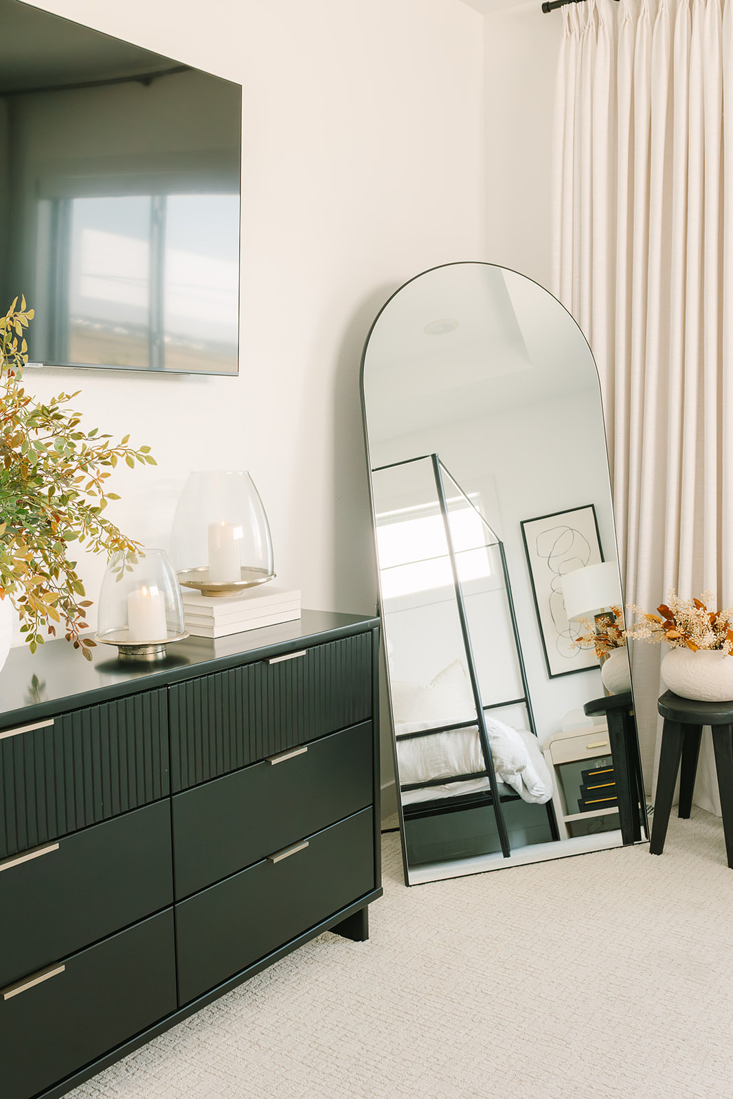 I love my dresser and large candles that feel so lux without overspending. Little accents like stool, vase and stems, plus my neutral curtains tie it all together.